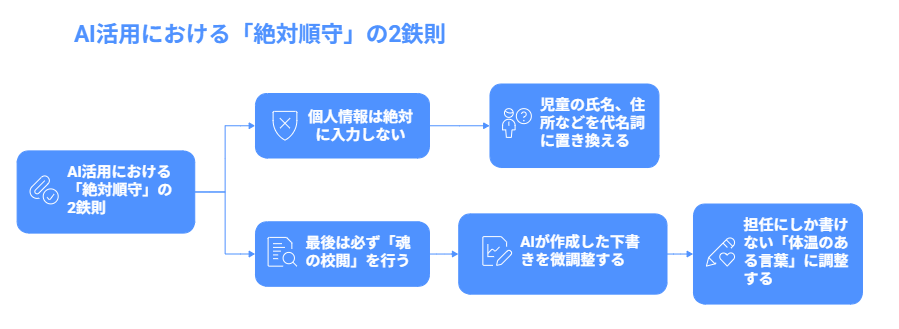 - AIが作るのはあくまで「下書き(たたき台)」です。最後は一人ひとりの顔を思い浮かべ、担任にしか書けない「体温のある言葉」に微調整することが、教師の最も大切な役割です。