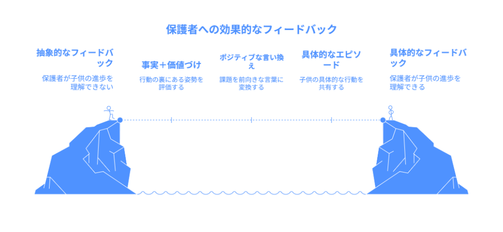 - ポジティブな言い換え(リフレーミング) 課題を指摘する場合も、前向きな言葉に変換することで、保護者の受け止め方が変わります。(詳細は後述)