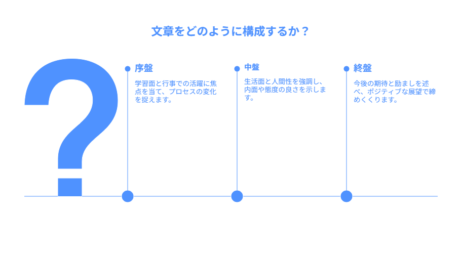 - 【序盤】学習面・行事での活躍 具体的に「何が」できるようになったか、どんな努力をしたか。単なる成績の要約ではなく、プロセスの変化を捉えます。