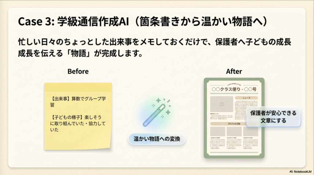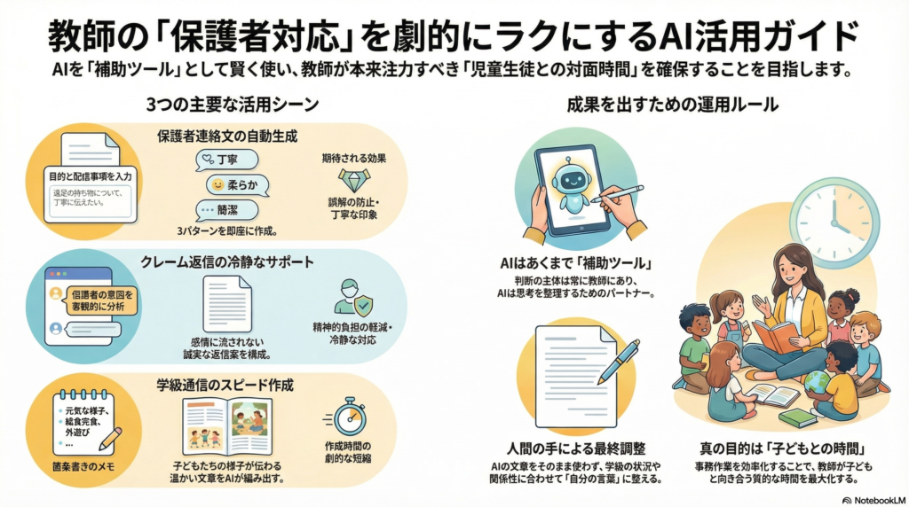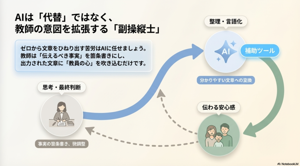 AIを「保護者に伝わりやすい文章を整えるツール」として活用します。
