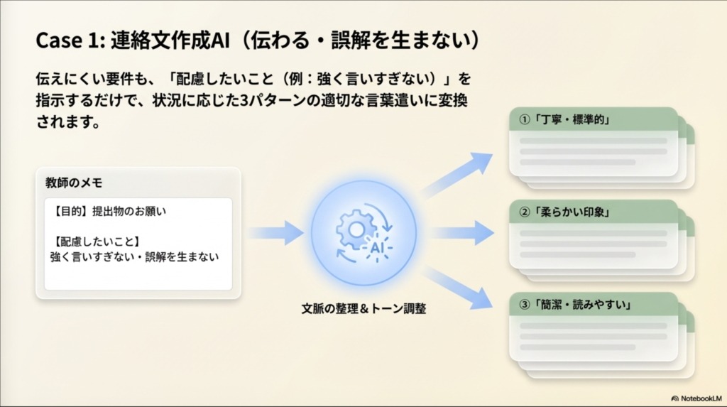 AIを活用することで、連絡内容を整理し、背景や意図を客観的に分析することができます。教師はその内容を参考にしながら、状況に合った返信文を作成することができます。