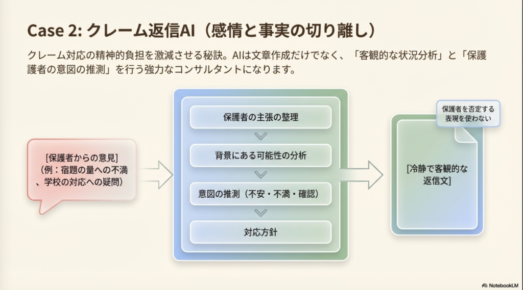・クレーム対応AI(保護者の意図を整理して対応を考える)