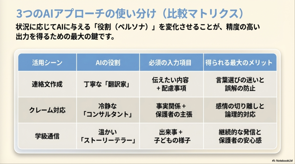 AIを活用することで、感情的にならず冷静に状況を整理することができます。AIは判断を代替するものではなく、教師が状況を客観的に捉えるための補助ツールとして活用することが重要です。