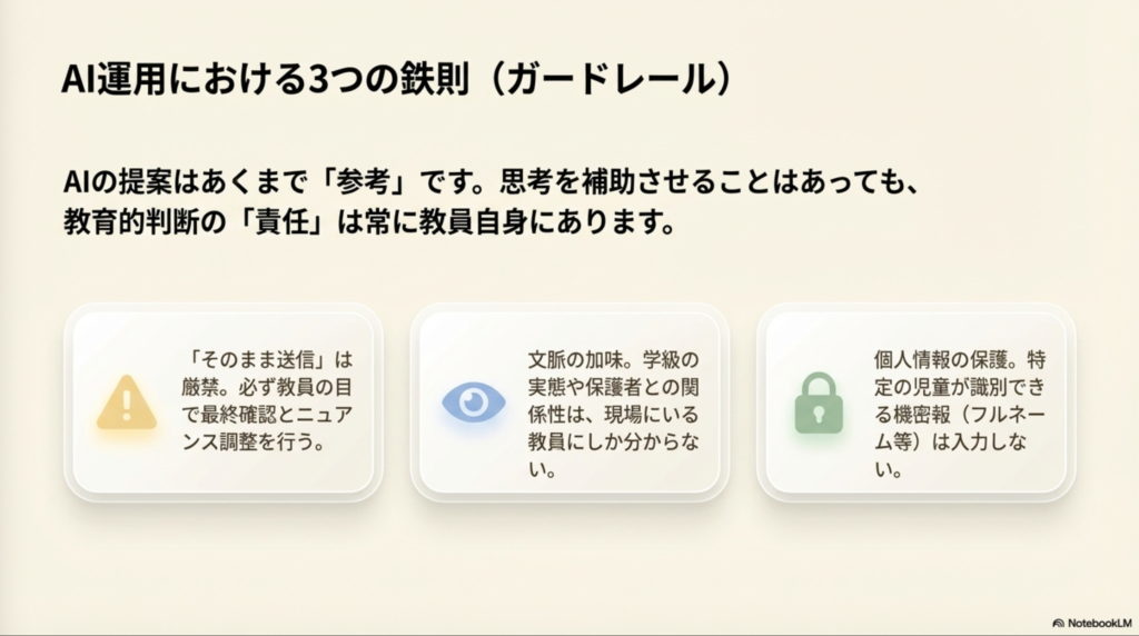 AIが作成した文章をそのまま送るのではなく、必ず教師自身が確認することが重要です。保護者との関係性や学校の状況によって、適切な表現は変わることがあります。