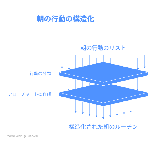 - 「処理」と「判断(分岐)」の区別: 行動を「起きる」「歯磨き」「ランドセルを置く」といった「処理(長方形)」と、「宿題があるか?」「雨が降っているか?」といった「判断(ひし形、分岐)」に厳密に分類し、フローチャートとしてデジタル化しました。