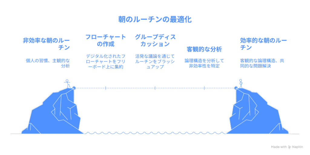 - 活発な議論の創出: 「この行動は本当に必要?」「順序を変えたらもっと速いかも?」「もし遅刻しそうになったら、どっちの分岐に進むべき?」といった活発な議論(ブラッシュアップ)が巻き起こりました。